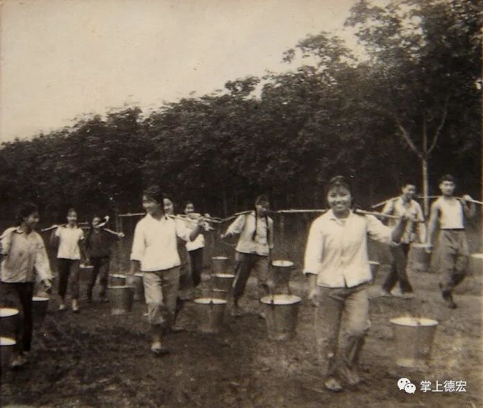 10年后的7月,在湖南祁东县,大批20出头的三湘儿女告别了父母亲人,远离家乡参与到边疆的社会主义建设中。1969年,毛泽东提出“知识青年到农村去”的号召,来自北京、上海、成都、湖南、昆明等全国各地的7357名知识青年到瑞丽农村“安家落户”。1970年3月,由云南保山、施甸动员贫下中农组织“一带毛泽东思想、二带科技技术、三带劳动力”的贫下中农宣传队到德宏,1100人的“贫宣队”来到瑞丽农村,成为“搬迁户”,随后以瑞丽、畹町农场为基础,组建云南生产建设兵团三师十一团。开荒、建厂,割胶、制胶。到1975年1月,瑞丽农场下辖勐卯、卡兰、贺腮、弄岛、雷允、莫里6个分场正式建制完成。63个生产队12842人。“地广人稀,边民外出”的情况被彻底扭转,瑞丽敞开了大门,迎接着春天的到来。